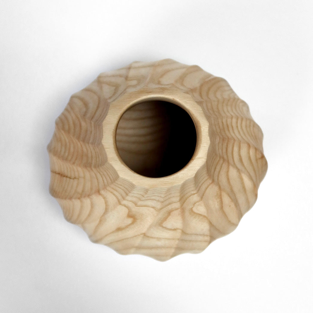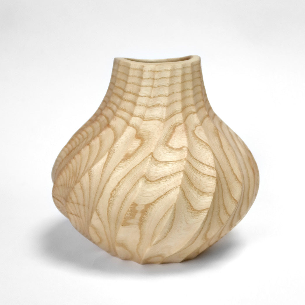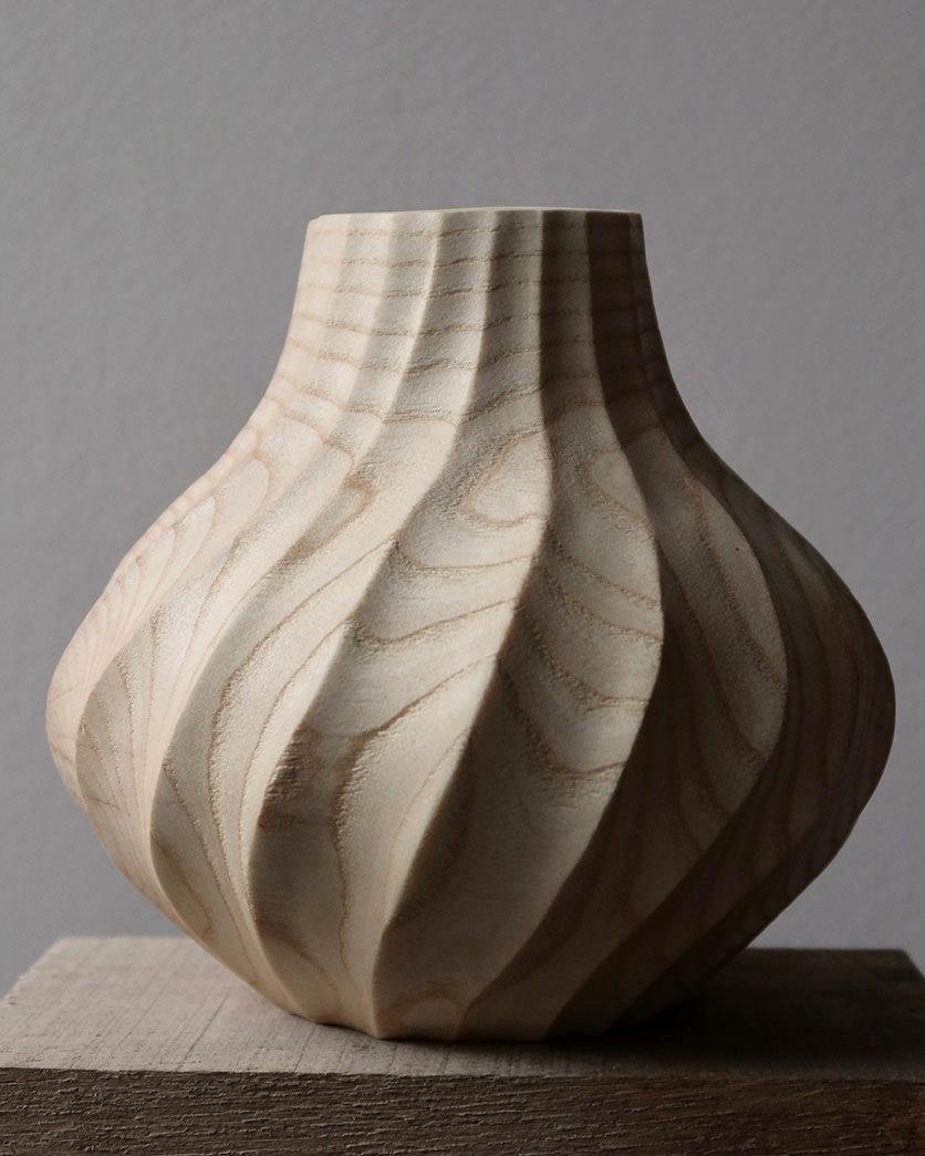 Denne vase er drejet i asketræ og er efterfølgende tekstureret i en spiralform. Overfladen er sandblæst, så årringene træder frem.