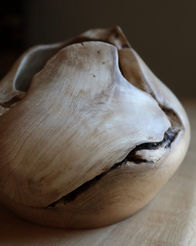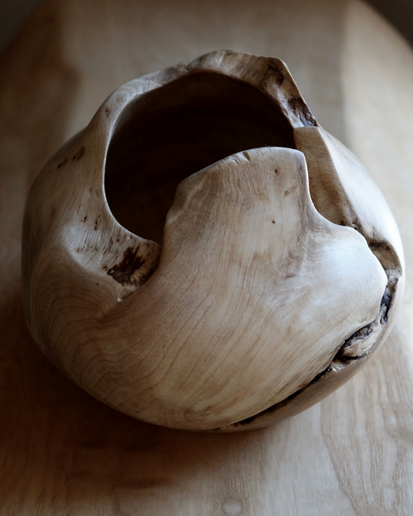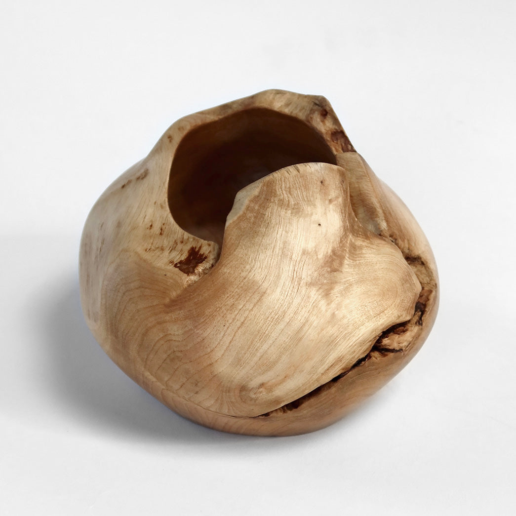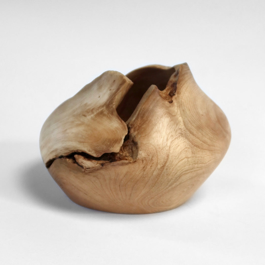 Formen er rund og fyldig med en asymmetrisk åbning, hvor træets naturlige kontur er bevaret.