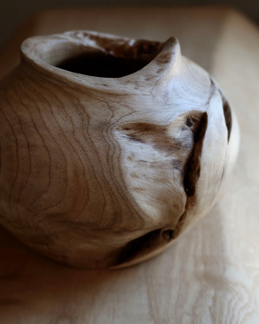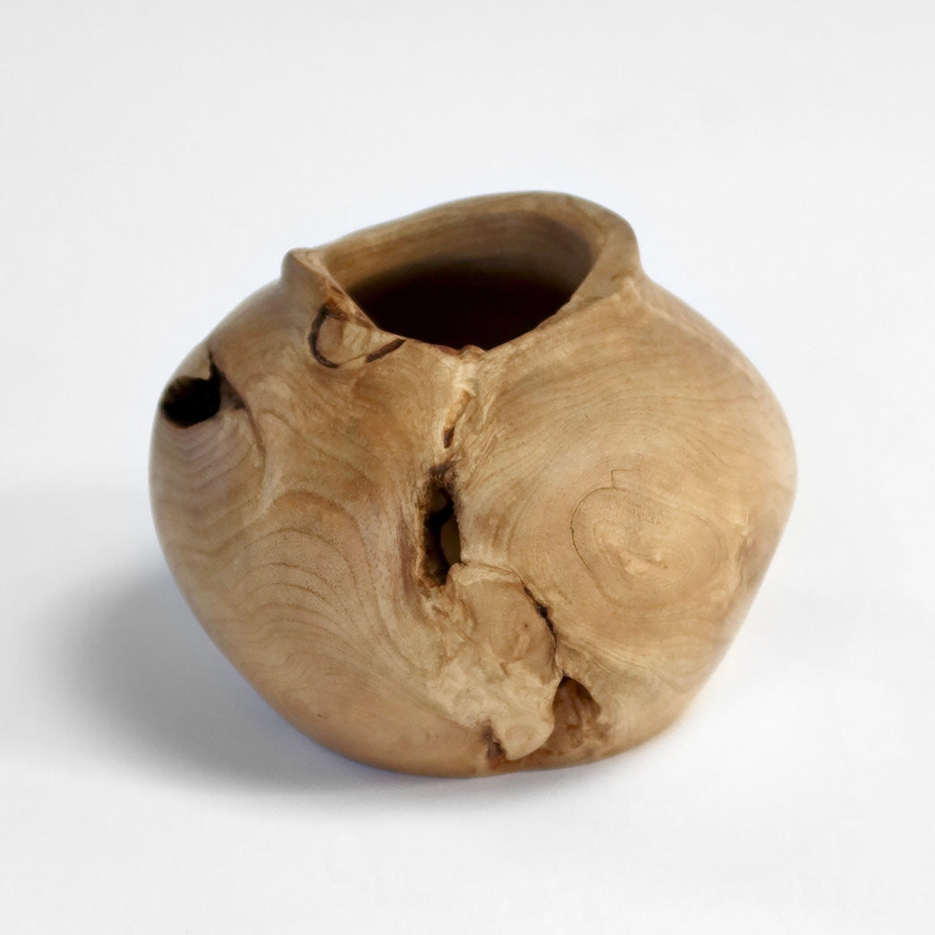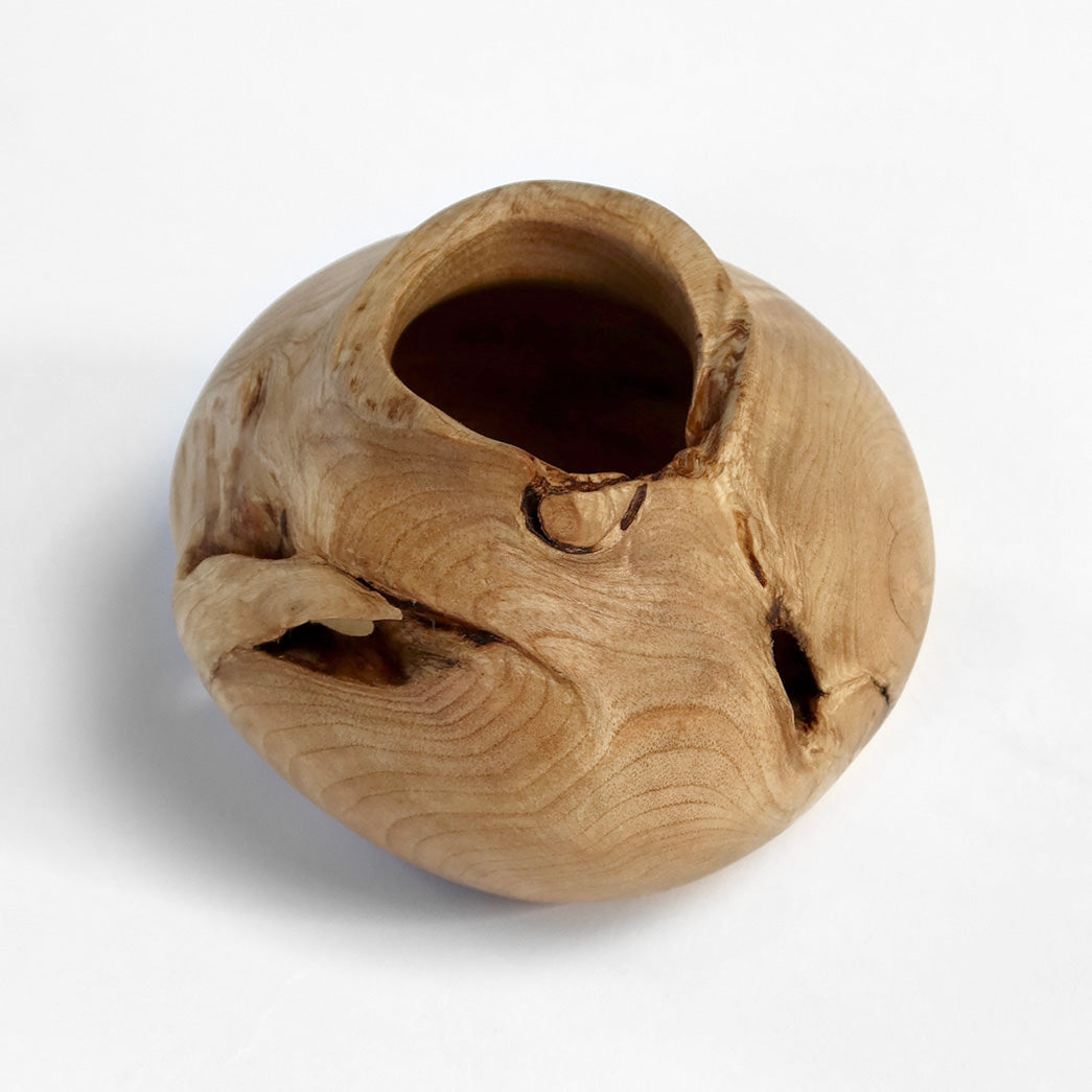 Formen er rund og fyldig med en asymmetrisk åbning, hvor træets naturlige kontur er bevaret.