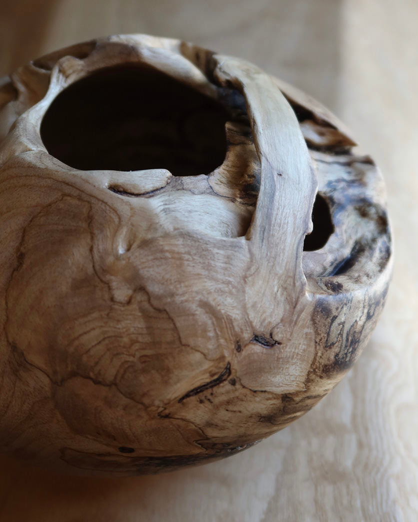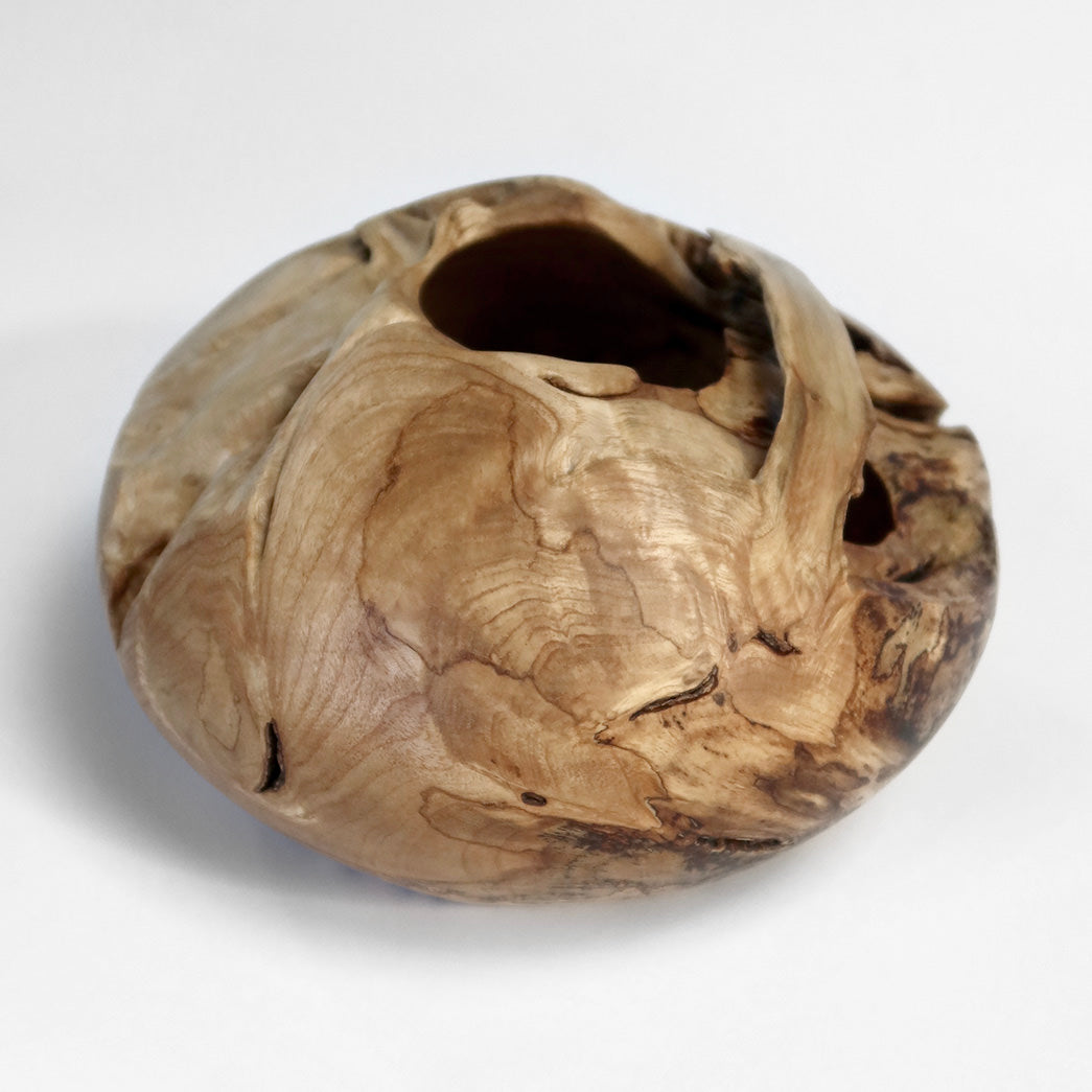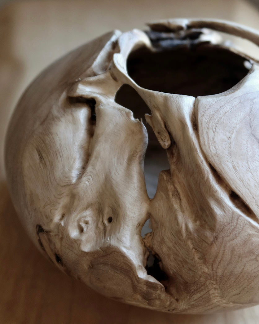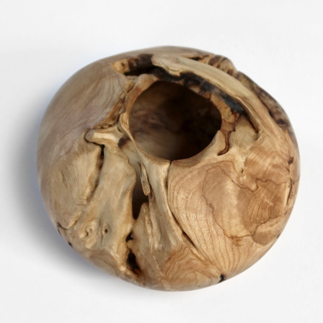 Formen er rund og fyldig med en asymmetrisk åbning, hvor træets naturlige kontur er bevaret.