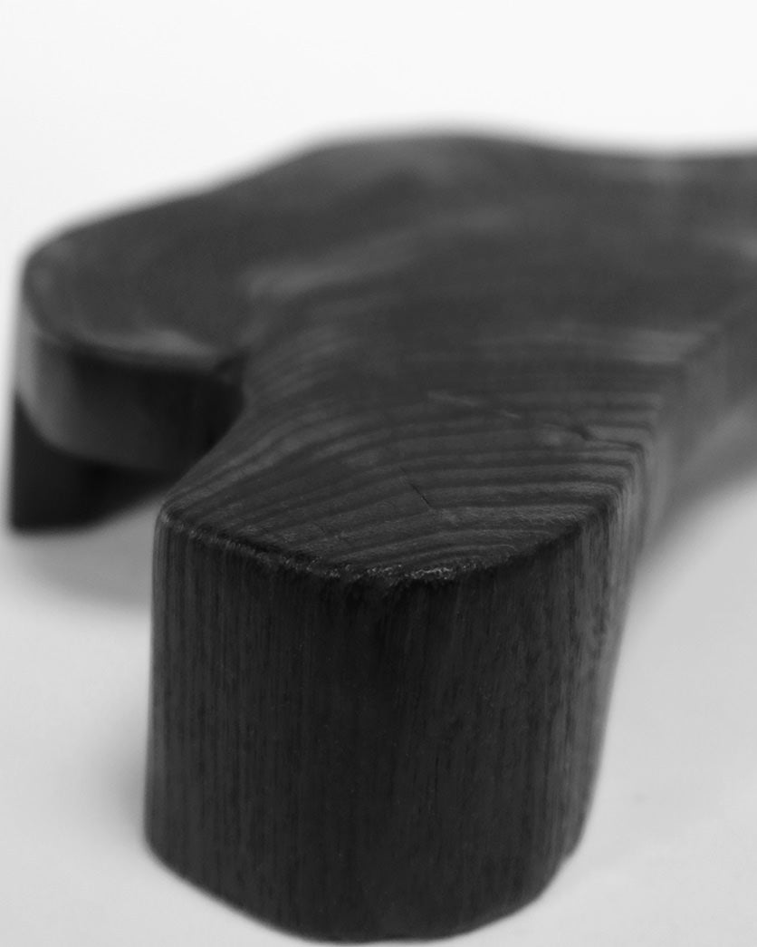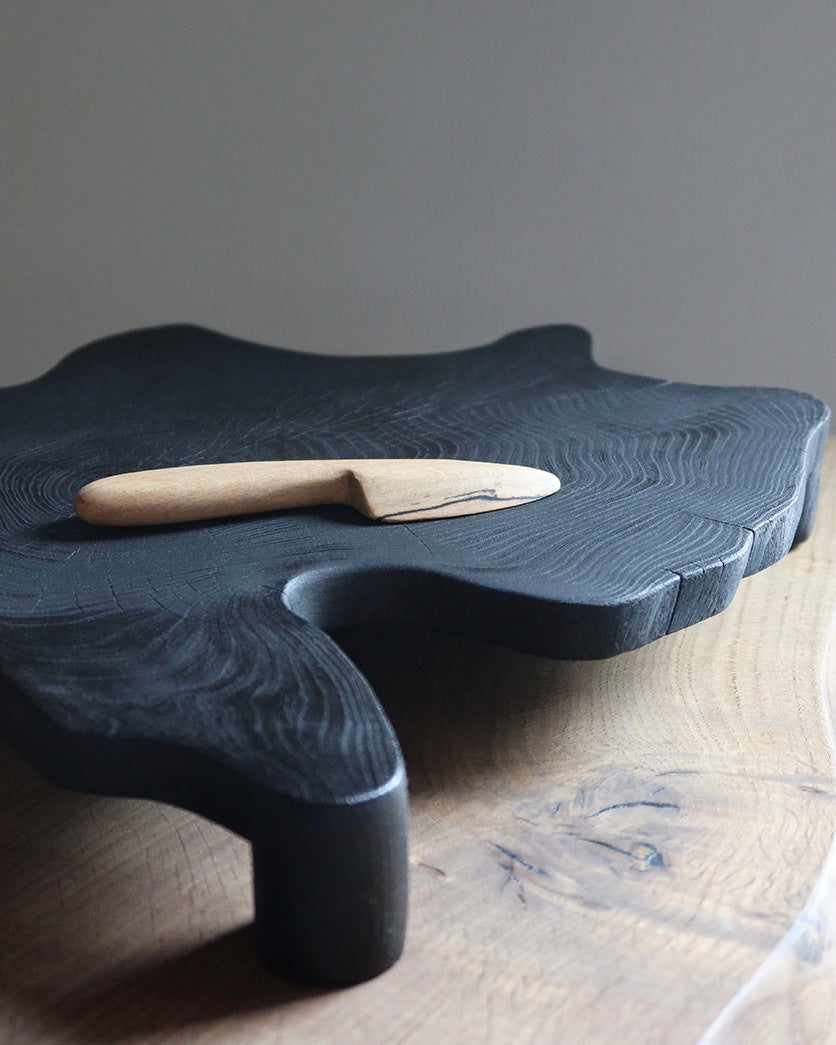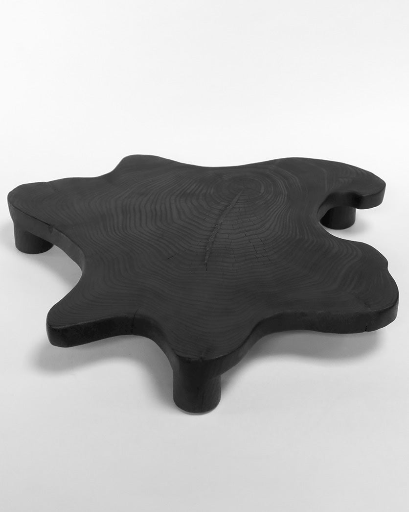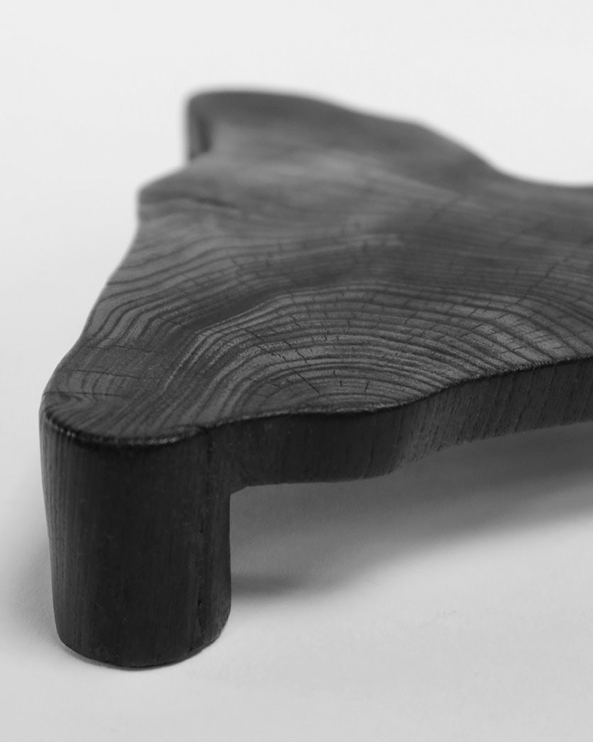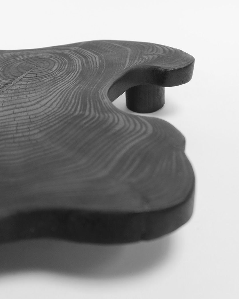 Fadene hviler på tre integrerede ben, der giver en stabil base og en let svævende fornemmelse. Overfladen er behandlet med Yakisugi - en traditionel japansk brændingsteknik, der fremhæver træets åretegninger og skaber en dyb, sort finish med en smuk taktil kvalitet.