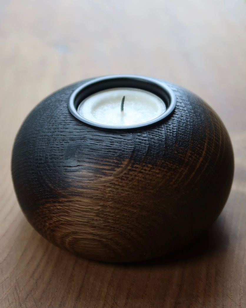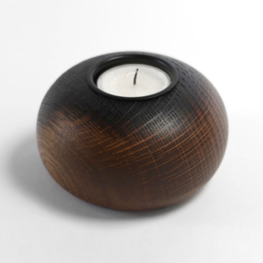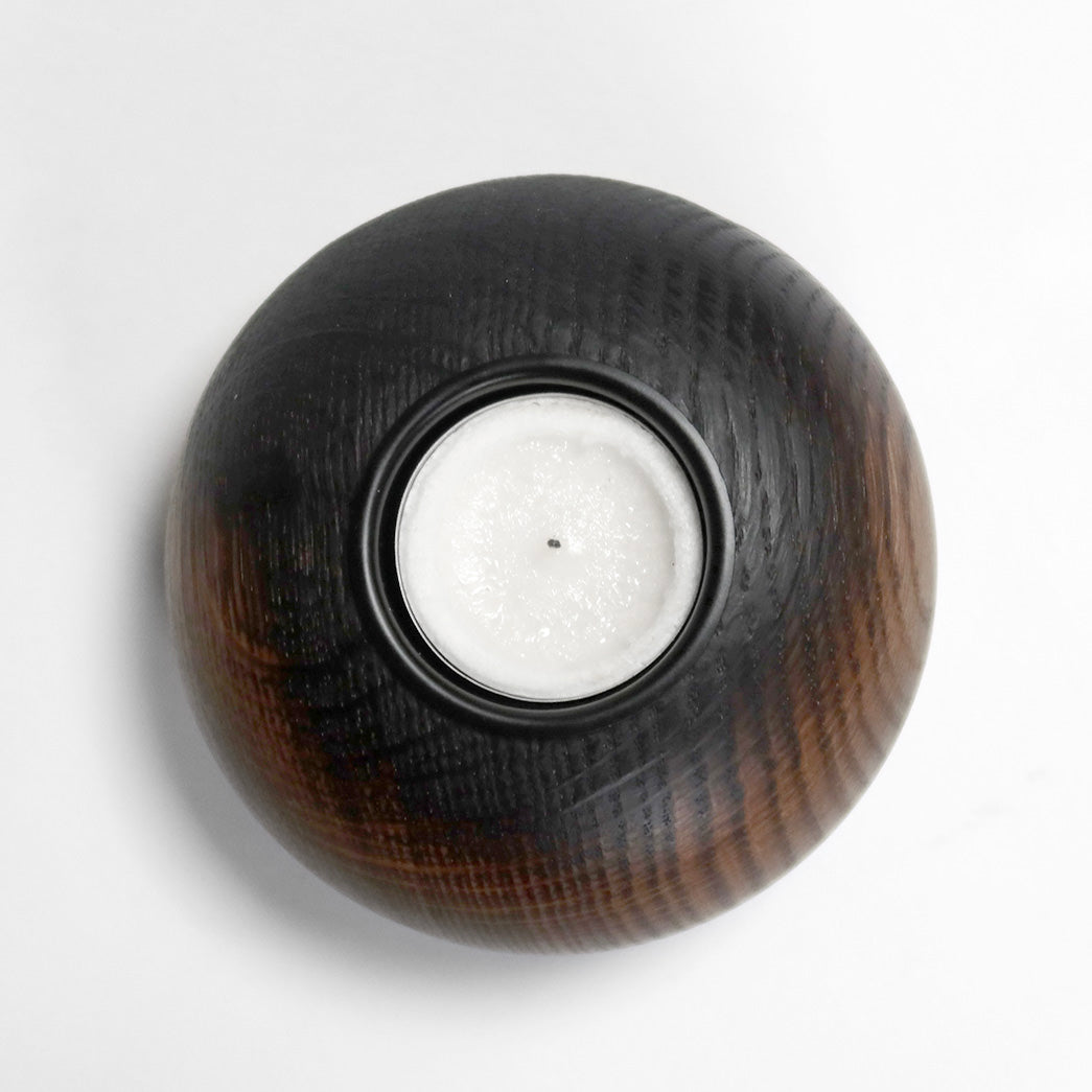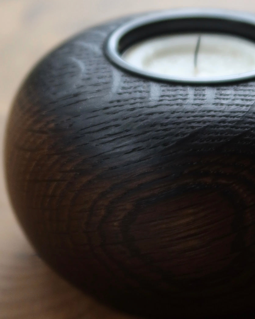 Det øverste af fyrfadsstagen er brændt - en detalje der symboliserer den ild, man tænder i lyset. Den brændte overflade har en naturlig ombré-effekt, hvor den mørke, intense farve gradvist smelter sammen med den varme tone fra røget eg.
