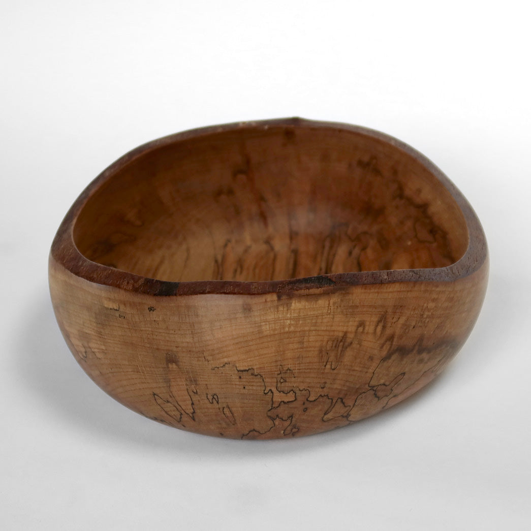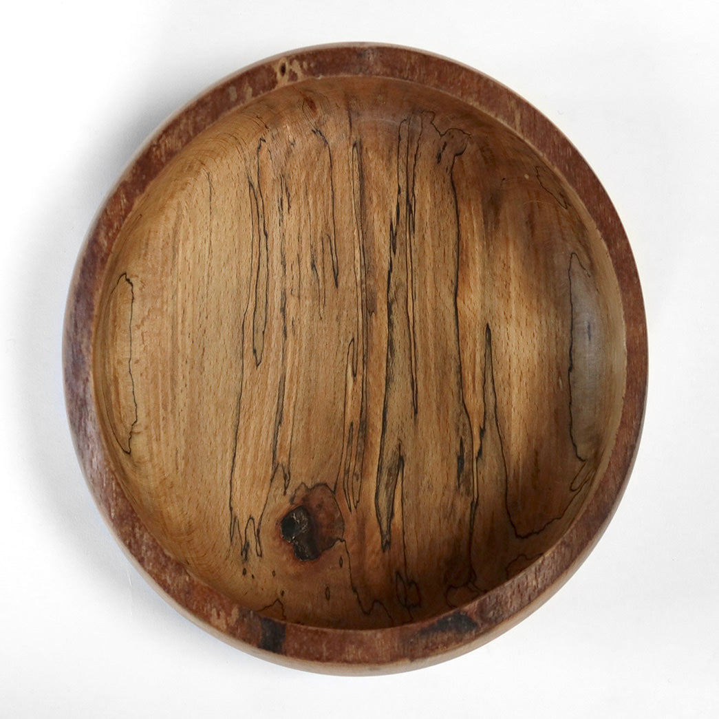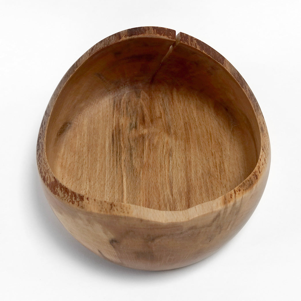 Skålen er drejet i bøg, udvundet fra et stormvæltet træ i en nærliggende skov. Stammen har ligget direkte på jorden gennem længere tid, hvor vejret og mikroorganismer har sat deres præg. Resultatet er smukke og unikke farvevariationer i træets overflade.