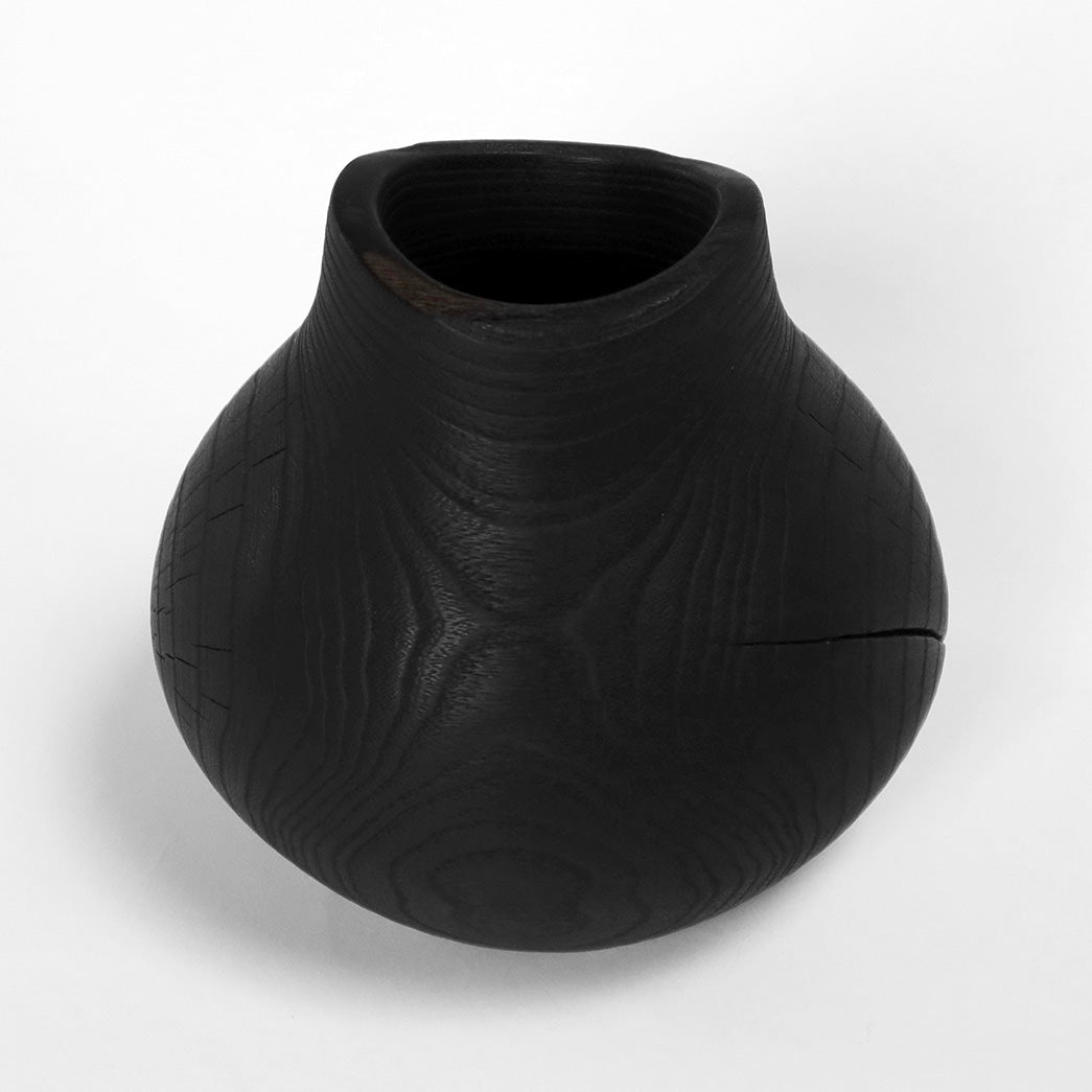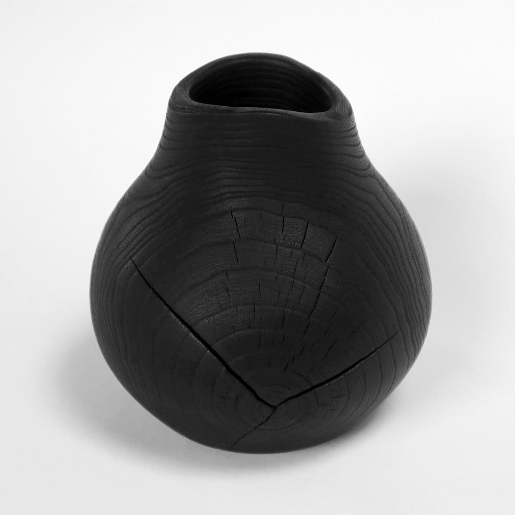 Denne vase er drejet i robinie og brændt på overfladen, hvilket giver den en dyb sort farve, hvor årringene træder tydeligt frem.