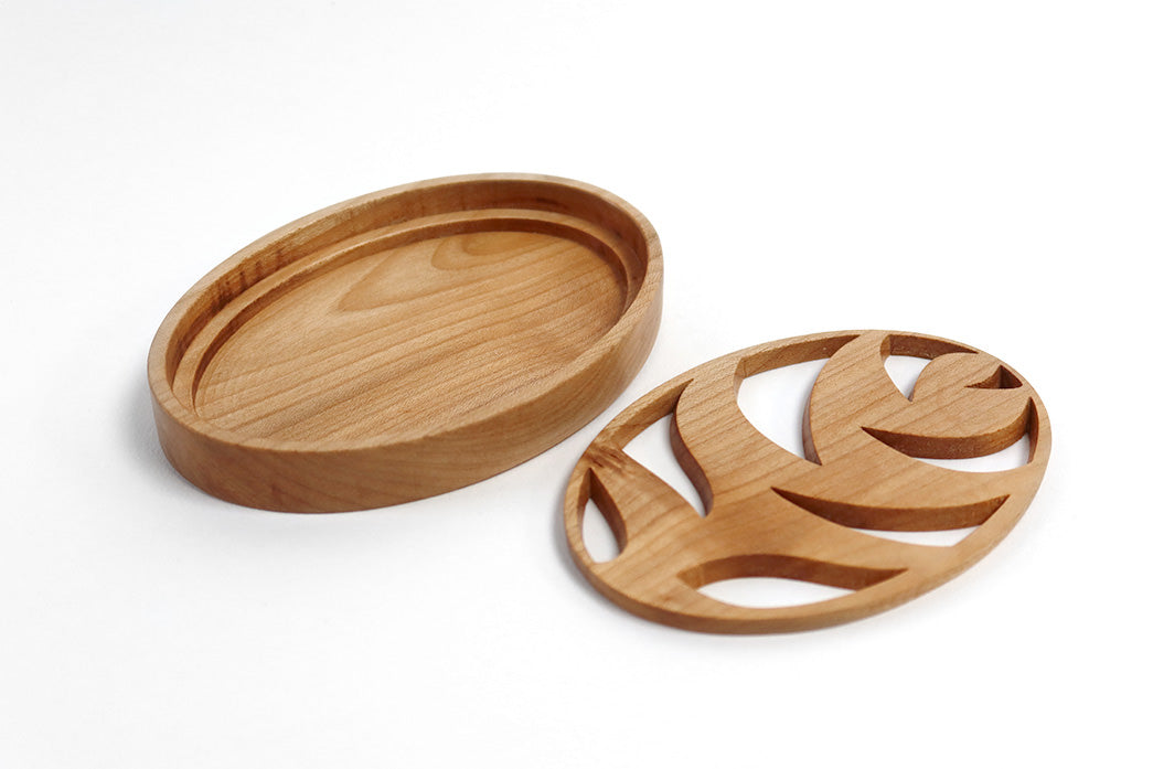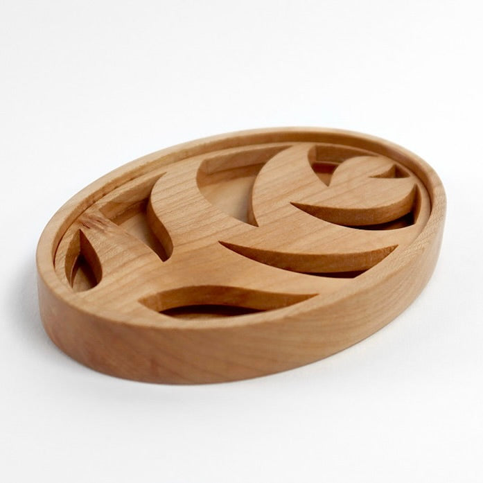 Sæbeholderen er udført i ahorn, med en oval form. Den har en lav skålform med et tilhørende låg, som fungerer som en platform til sæben.