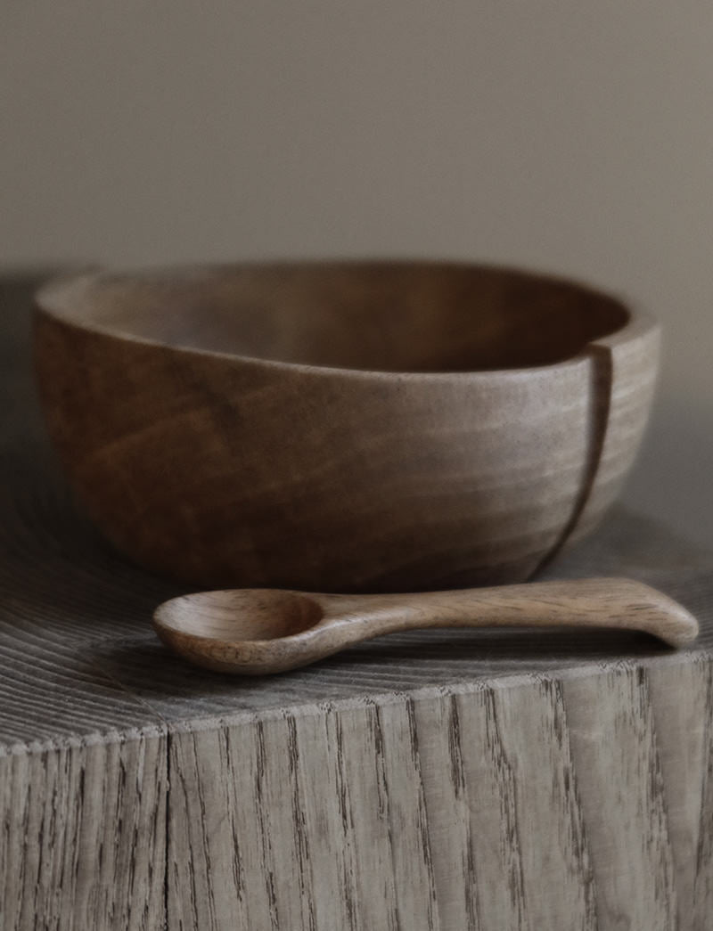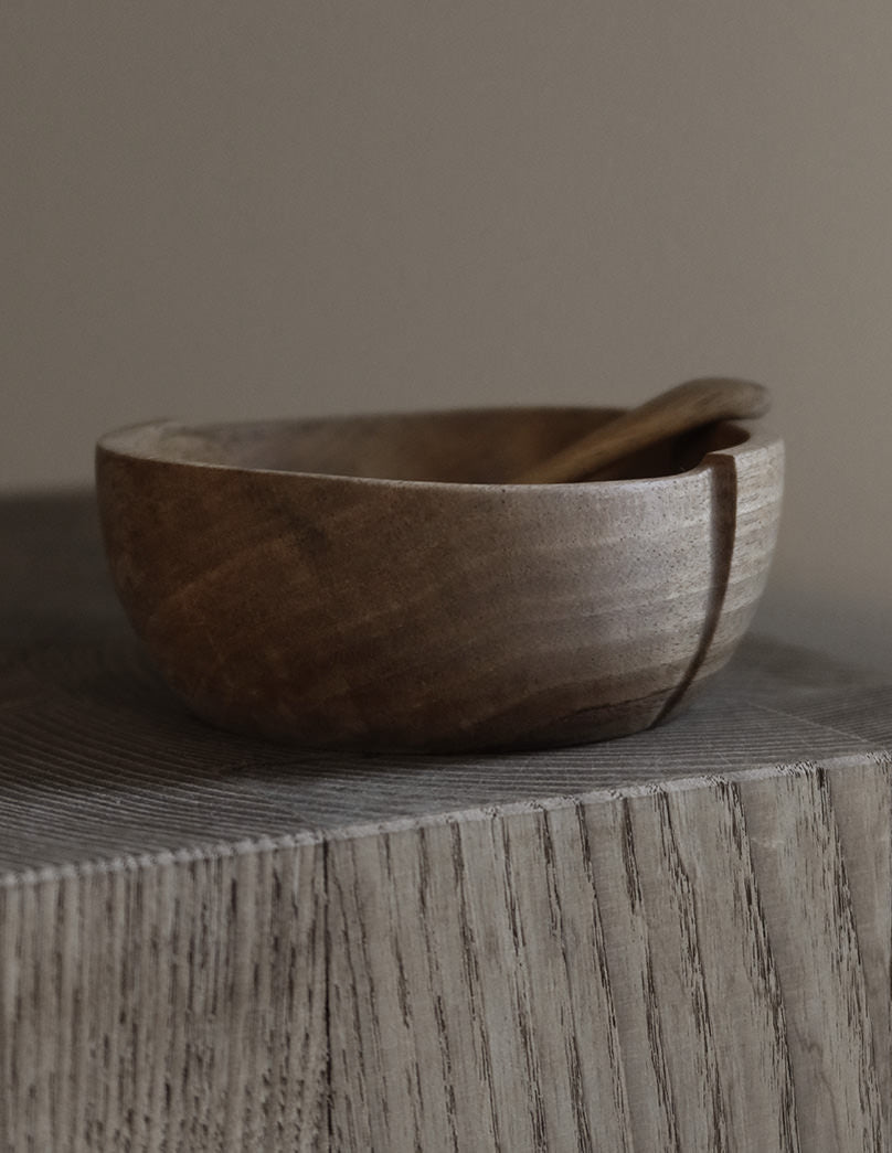 Skålen og skeen er behandlet med Danish oil for at pleje og beskytte træets overflade. De kan genbehandles med olie efter behov. Se mere om vedligeholdelse af træprodukter.