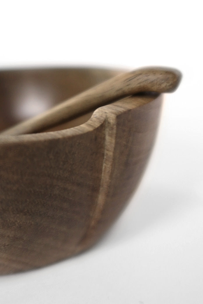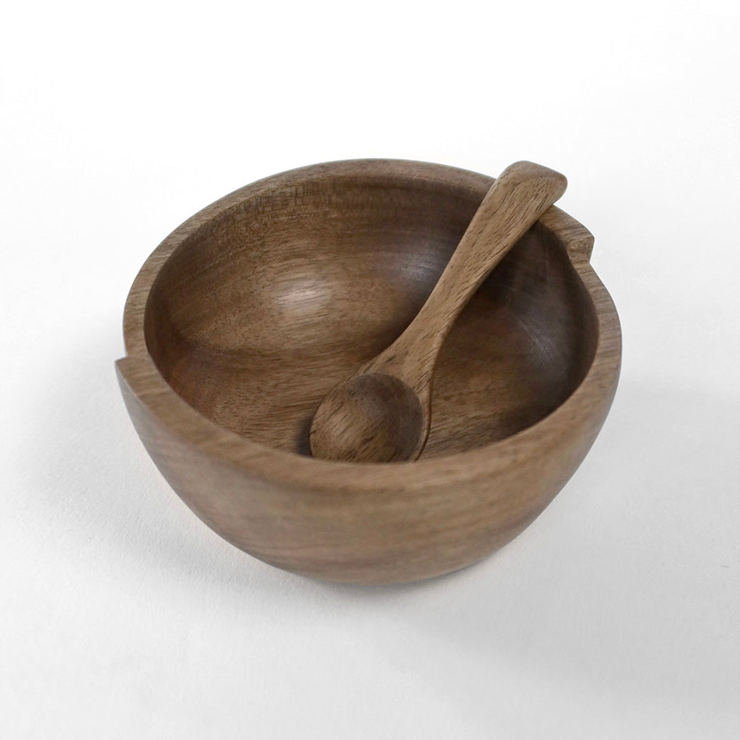Den tilhørende ske er lavet i samme træsort. Skaftet buer let i enden, så skeen kan hvile naturligt på skålens kant.