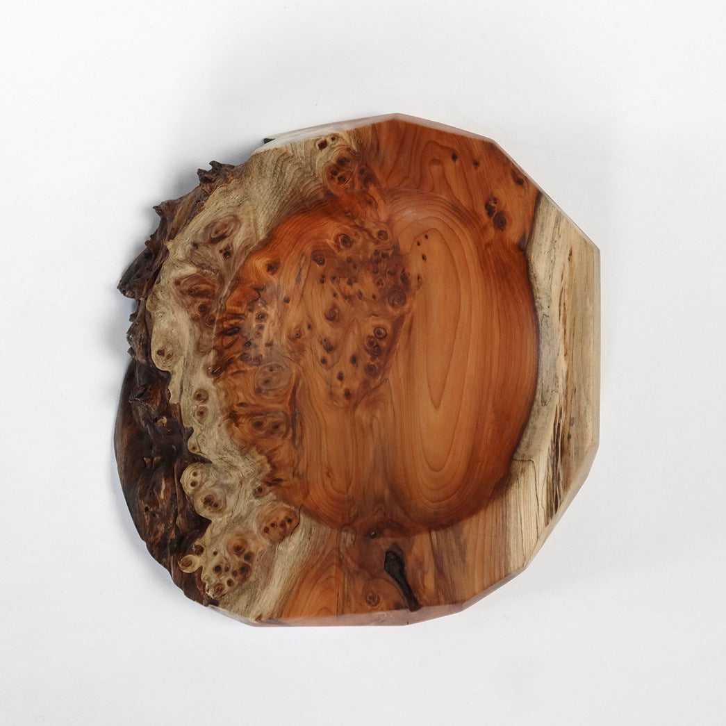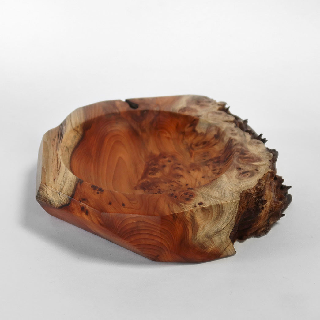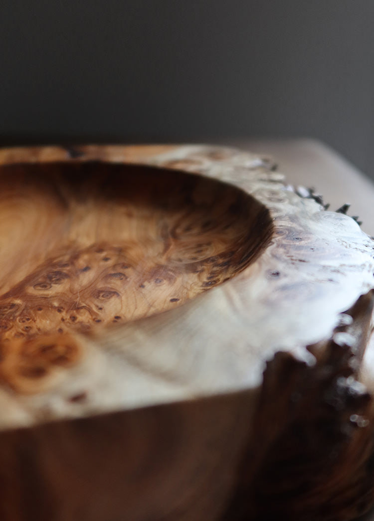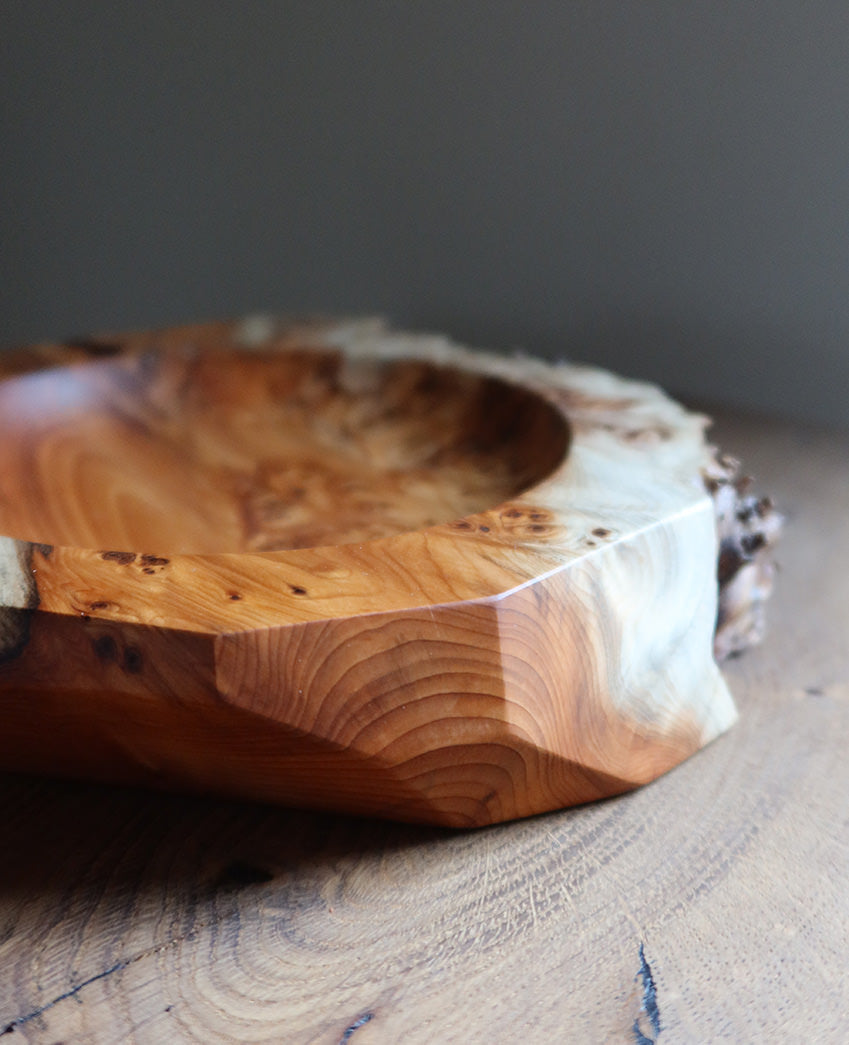 Dette fad er drejet i taks og formgivet med en naturlig kant, hvor træets egen form og struktur får lov at bestemme udtrykket. Udhulningen har en blød runding, mens kanterne er skåret i forskellige skrå vinkler, så hver form passer til træets naturlige bevægelse.