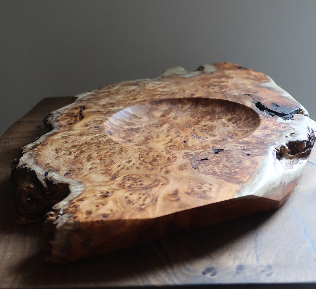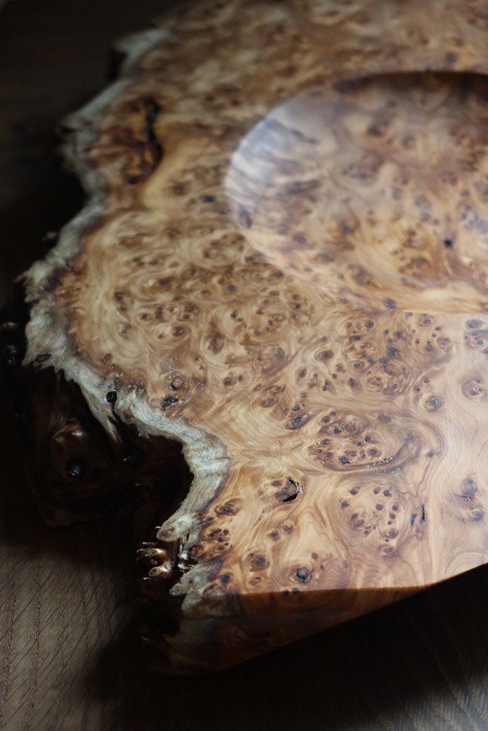 Dette fad er drejet i taks og formgivet med en naturlig kant, hvor træets egen form og struktur får lov at bestemme udtrykket. Udhulningen har en blød runding, mens kanterne er skåret i forskellige skrå vinkler, så hver form passer til træets naturlige bevægelse.