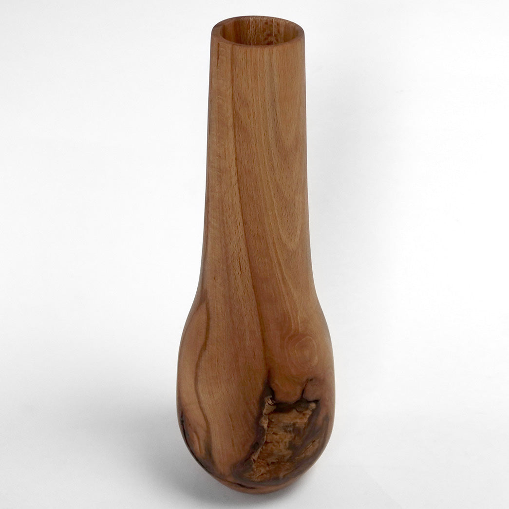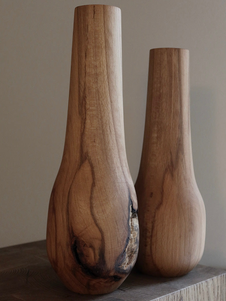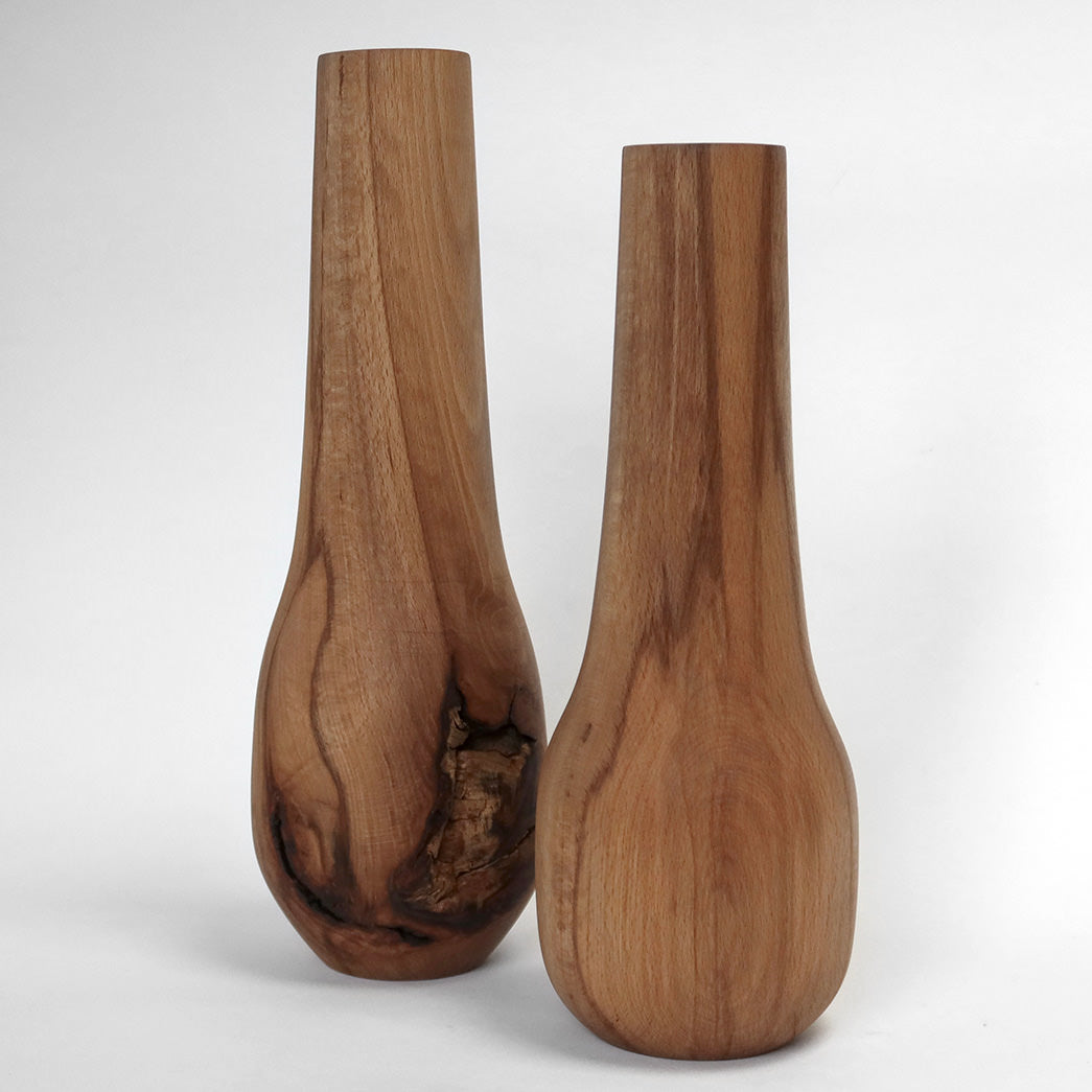 Vaserne er drejet i bøg og har en høj, skulpturel silhuet. Den runde, tunge bund smyger sig op i en lang, smal hals. Bøgetræet varierer naturligt i farve og struktur, og de bærer spor af træets egne ufuldkommenheder, som giver dem hver deres unikke udtryk.